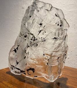 Fittingly installed on a low pedestal beneath Smith’s drawings, we nearly trip over Sailor’s Slipper, a cast-glass Croc sandal by Kat Ryals. It gleams with irreverence. Echoes of mall culture and fairy-tale longing are folded into its glossy form, casting the ordinary as mythic. Humble, tender, and slightly absurd, it offers something from a parallel world where even the discarded is held with care. Like much of Ryals’ work, it blurs the line between kitsch and devotion. She treats mass-produced objects not as ironic detritus but as vessels for memory, desire, and transformation.