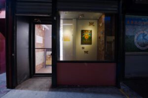 I arrived at GLORIA’s on Eldridge Street in the Lower East Side of Manhattan just as dusk fell, the sky an indeterminate grey. In the entrance alcove radiated Jacob Hicks’ Woman 63, a highly rendered, futuristic oil painting flanked by hovering paper butterflies. Hicks refracts femininity through sacred geometry and speculative power, crafting an image that feels more like a portal than a portrait.