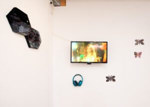 Harry twitches his ear and spins me in a slow circle. Behind the entry wall, beneath another quiet swarm of cut-out butterflies by Concetta Smith, a video monitor flickers. Underneath, a pair of headphones waits as an invitation.