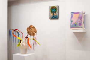 Katie Kotler’s video works serve as the gateway into the thematic core of Dream Junk & Cosmic Dust. In The Anita Mann Case, psychedelic play-dough figures in vivid reds, pinks, greens, and purples enact a surreal drag performance that oscillates between seduction and collapse. The stop-motion animation’s tactile quality underscores the exhibition’s exploration of transformation and the ephemeral nature of identity.