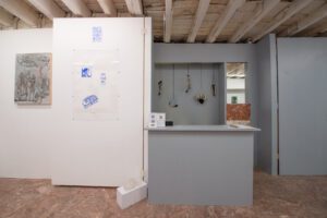Next to The Argument, Mallory Concetta Smith’s blue pencil drawings drift between observation and reverie. Studio Bathroom Wall and a Chapel offers a veil of patterned marks, both accidental and devotional. Father Daughter Spirit gathers a portrait, a beer can, a box of cookies. Small, intimate artifacts bound by memory and affection. These are not grand relics but personal debris. The kind that hovers at the edge of awareness. Her drawings form quiet constellations of the everyday. She treats emotional residue and domestic detritus with tender regard. The sacred, here, is not above us but scattered softly across the floor.