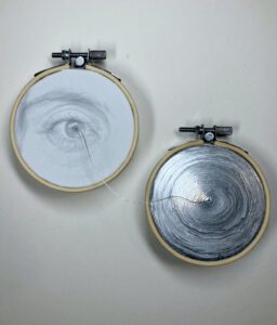 Hung high on the wall like distant portals, Helena La Rota López’s Nariz and Cintura remain in their embroidery hoops. Those soft circular frames holding the weight of the body with quiet intensity. These pale portals murmur rather than declare, mapping the memory of the sensory self through stitched fragments: an eye, a nose, a waist. Embroidery, a traditionally domestic and feminized craft, becomes here a method of attunement that is tactile, repetitive, and embodied. These works position the body as both archive and cosmos. They remind us that the intimate is never separate from the infinite, and that the domestic space is often where dreaming begins.