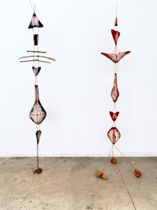 I am mesmerized as Harry veers us gently to the right, toward Witnesses, a hanging anthropomorphic totem also of felted forms. It traces the immigrant body in flux, continuously reconstructing itself from the residues of migration and memory.